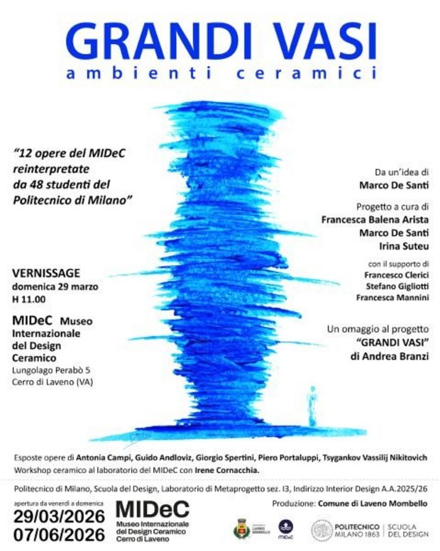 Dodici opere della collezione permanente del MIDeC (Museo Internazionale Design Ceramico) vengono reinterpretate da 48 studenti del Laboratorio di Metaprogetto sez. I3 di Interior Design. Da questo lavoro nascono 12 progetti di “ambienti ceramici” che trasformano la dimensione del vaso in installazioni tra scenografia e architettura. Come veri e propri “Grandi Vasi”, questi spazi accolgono e riflettono il nostro essere nella contemporaneità, tra riti, ossessioni, abitudini e sogni.
