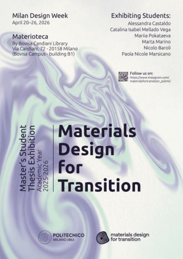 La mostra presenta una raccolta di progetti di tesi magistrale sviluppati sotto la guida della Prof.ssa Valentina Rognoli, del Prof. Giovanni Maria Conti, di Sonia Massari, Daniele Tamborini e dei membri del gruppo Materials Design for Transition.